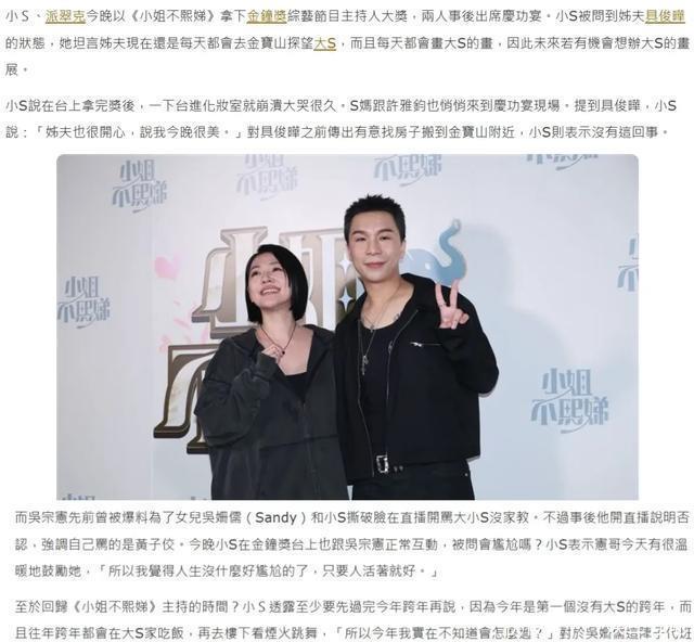 派翠克说自己真的不知情,但是在休息室见到了小S,大赞她的状态好,完全就是个小孩子。 小S是不是出了什么状况?将用何种方式亮相? 悬疑感瞬间又被拉满。 3 直到晚上十点,颁奖礼接近尾声的时候,蔡康永在《康熙来了》的音乐声中出现,接着小S闪亮登场。 小S穿着优雅的黑色露肩礼服,整个脸是浮肿的,长相越来越像大S了。